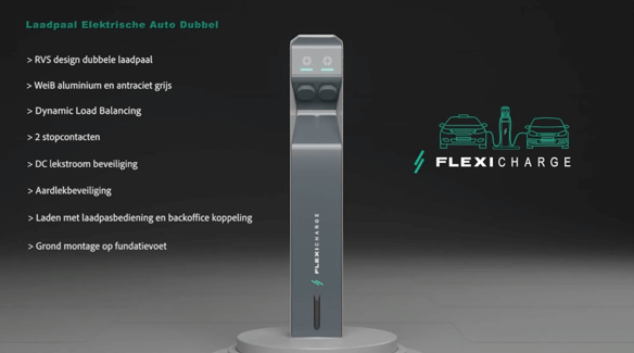 De laadpaal die wij aanbevelen voor bedrijven, is de dubbele laadpaal van Flexicharge, dit bedrijf van Nederlandse bodem heeft een zeer betrouwbare en strakke laadpaal ontwikkeld. Het vermogen is 2x22kW en ze kunnen eenvoudig uitgebreid worden met meerdere palen.
